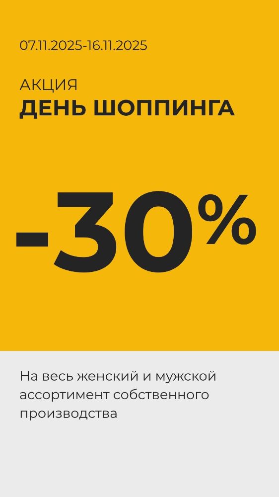 Акция «День шопинга 11.11» с 07.11 по 16.11.2025 г. скидка 30% на весь женский и мужской ассортимент собственного производства.