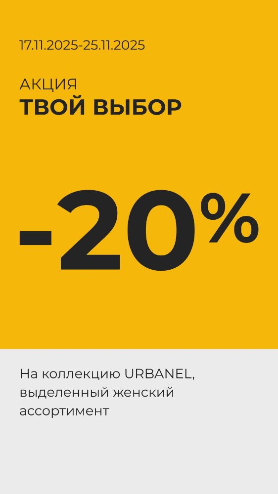 Акция «Твой выбор» с 17.11 по 25.11.2025 г. скидка 20% на выделенный женский ассортимент и коллекцию URBANEL.