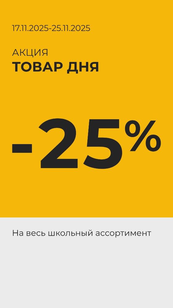 Акция «Товар дня» с 17.11 по 25.11.2025 г. скидка 25% на весь школьный ассортимент.