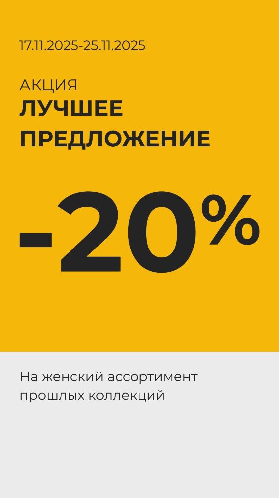 Акция «Лучшее предложение» с 17.11 по 25.11.2025 г. скидка 20% на женский ассортимент собственного производства по июнь 2025 года включительно.