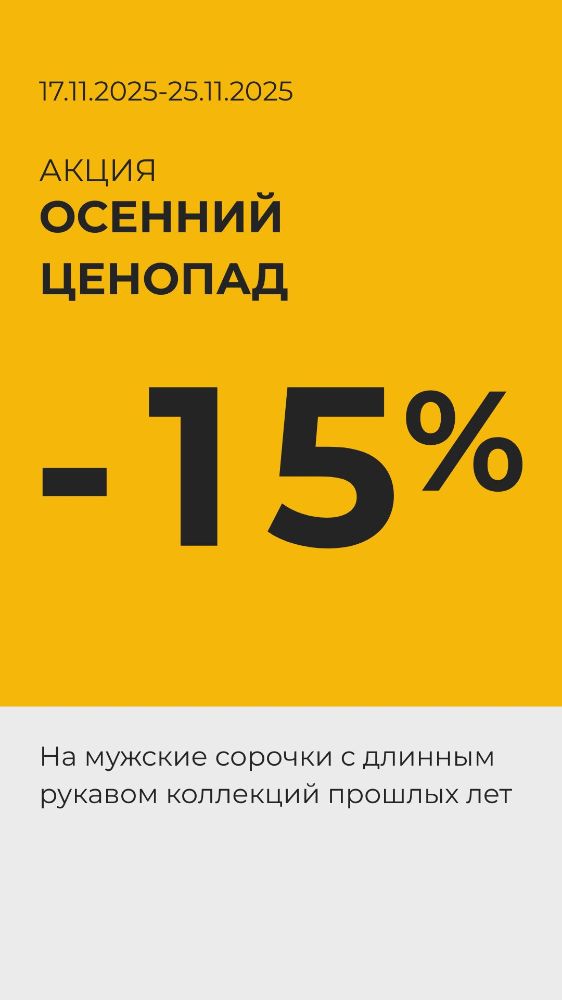 Акция «Осенний ценопад» с 17.11 по 25.11.2025 г. скидка 15% на сорочку мужскую длинный рукав производство по 2024 год включительно.